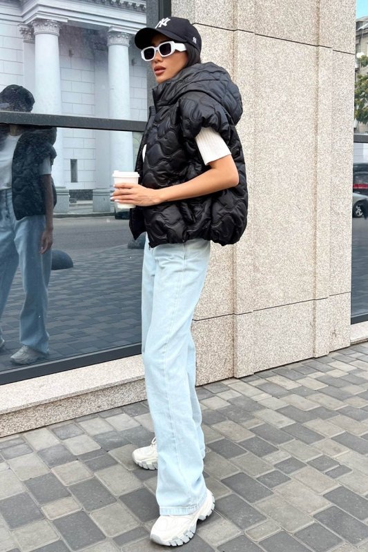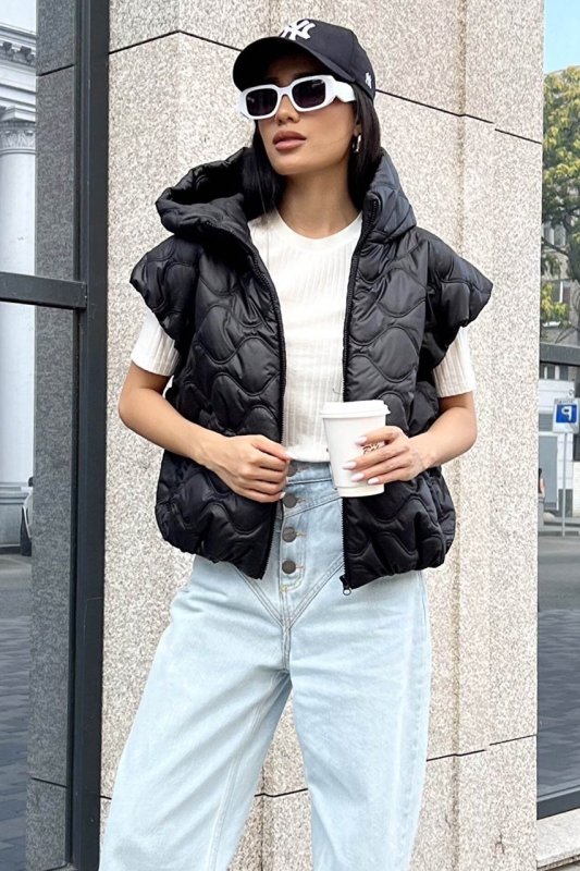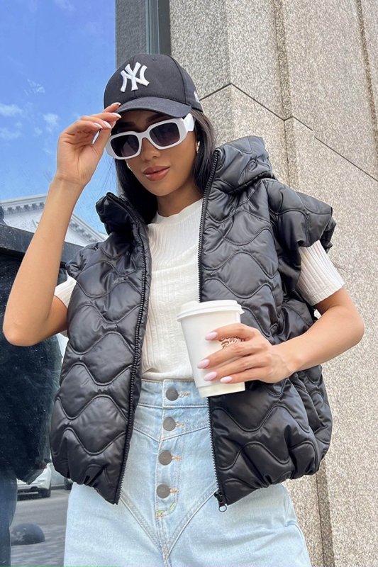 Модна укорочена жилетка на блискавці еластичним елементом на поясі, коміром-стійкою, та об’ємним капюшоном.