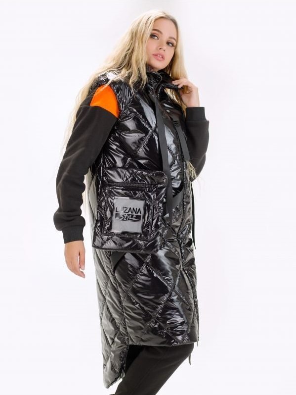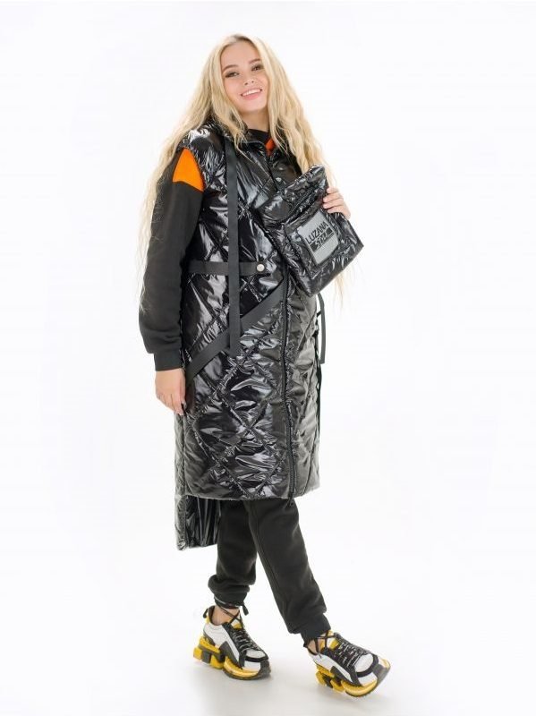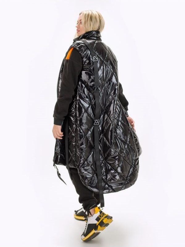Стьобаний подовжений жіночий жилет Джеррі-це комфортна, невагома модель, ідеальна для прохолодної погоди. Жилет на синтепоні з підкладкою. Комір-стійка регулюється зав'язками. Застібається жилет на двосторонню блискавку. Бігунок зі стрічками, на одній - декор у вигляді логотипу бренду. Жилет оформлений стрічками по переду і на спинці. Спинка подовжена. У бічних швах кишені на блискавках. Знімна кишеня-сумка кріпиться до жилета на кнопку і стрічку. Декорований написом. Складається з двох відділень, одне - на широкій блискавці, інше - у вигляді накладної кишені.