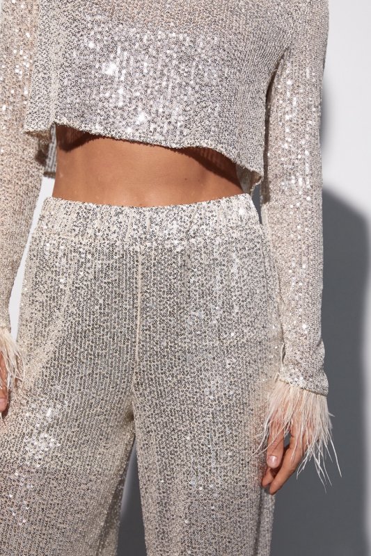 Брючний костюм с пайетками и перьями на рукавах - 9549 бежевый