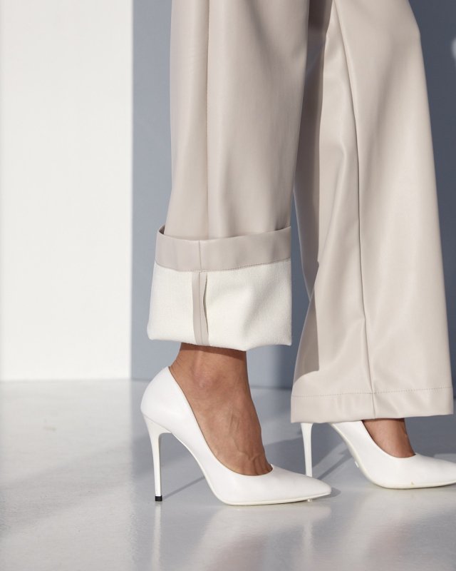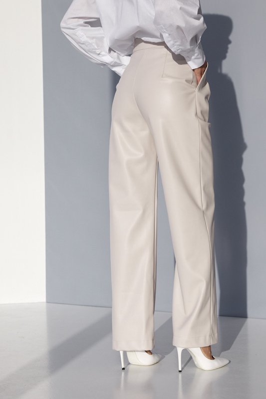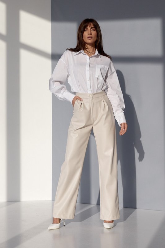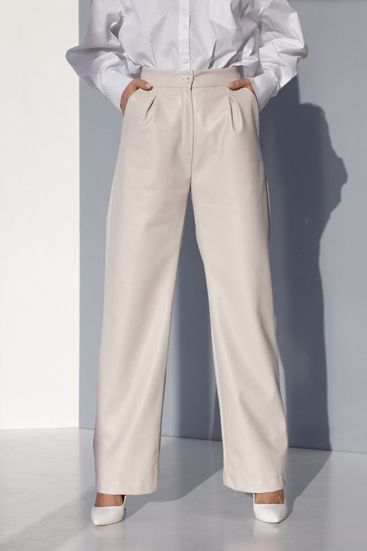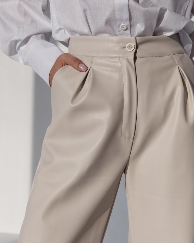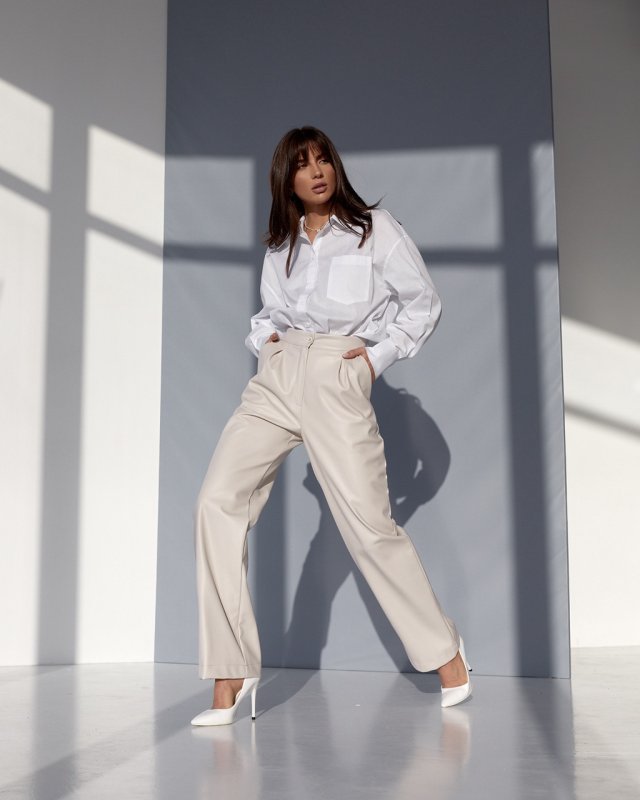 Брюки палаццо свободного кроя с высокой посадкой, защипами спереди, на поясе. В боковых швах обработаны карманы. Застежка на тесьму-молнию и петлю пуговицу. На задней половинке отделанные талиевые вытачки.