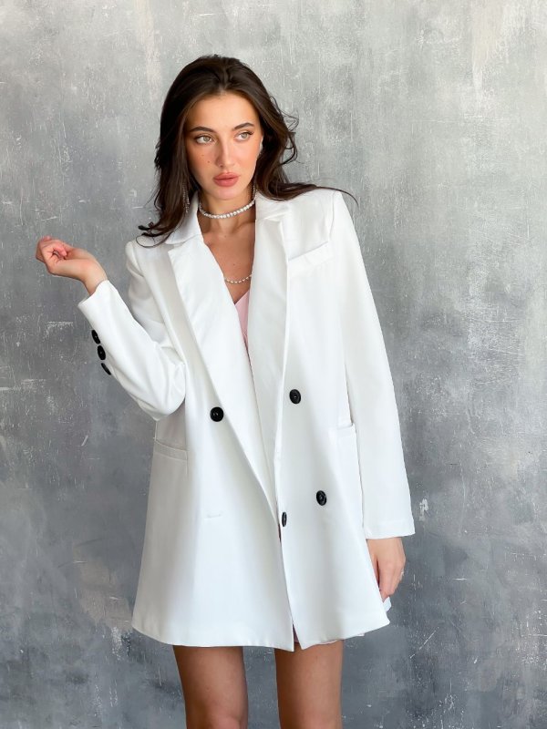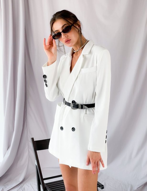 Удлиненный блейзер с двубортным дизайном. Лацканы с разрезами, подплечники, рукава с декоративной планкой. Нагрудный фальш-карман, прорезные боковые карманы, планка на пуговицах, есть подкладка. Ремень в комплект не входит.