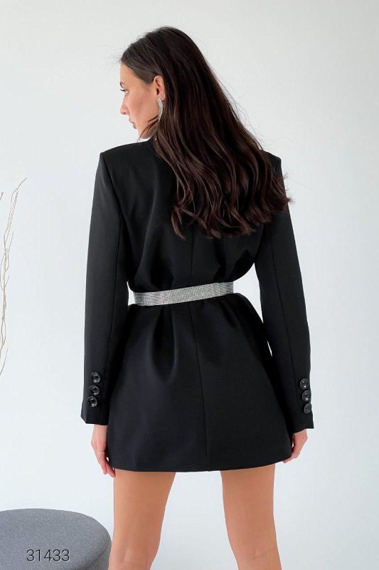 Удлиненный блейзер с двубортным дизайном. Лацканы с разрезами, подплечники, рукава с декоративной планкой. Нагрудный фальш-карман, прорезные боковые карманы, планка на пуговицах, есть подкладка. Ремень в комплект не входит.
