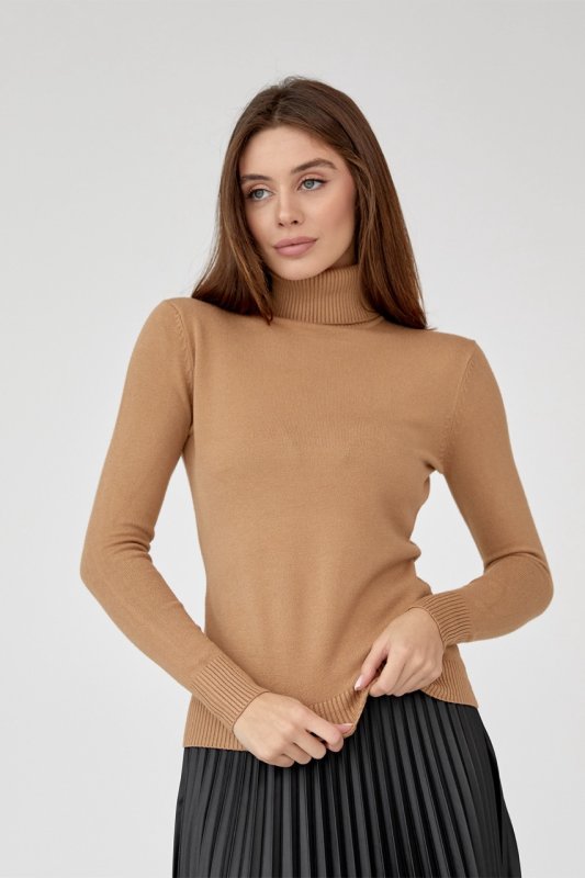 Трикотажный теплый гольф с круглой горловиной, высота вортника-стойки 15 см. Рукава втачные, длинные. По низу изделия и рукавов: манжет-резинка.