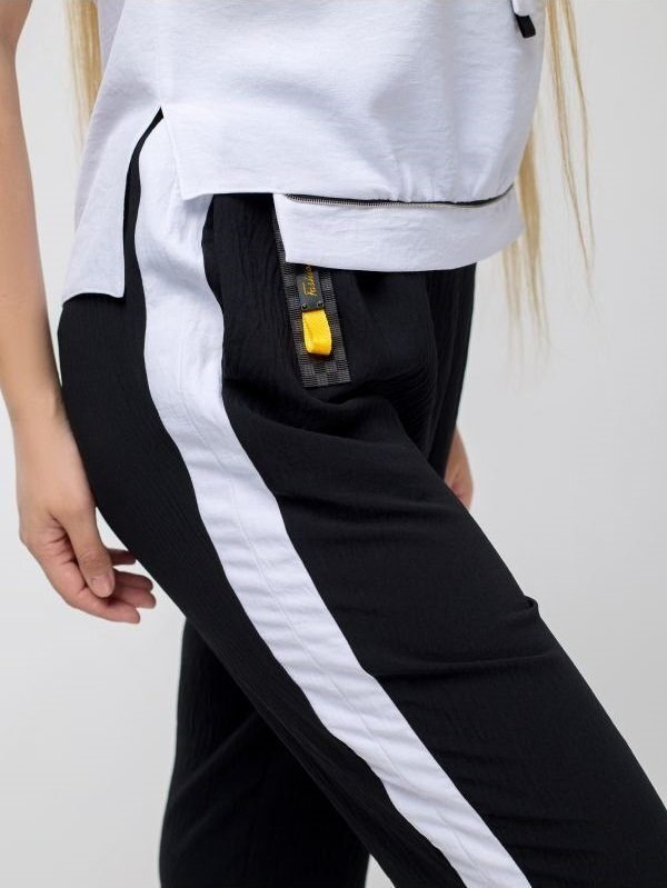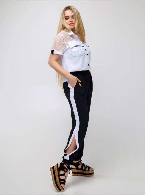 Брюки свободного кроя, с лампасами из ткани контрастного цвета и вырезами в нижней части. Манжеты на резинке. Пояс со съемным декоративным элементом. Спинка пояса из эластичного материала.