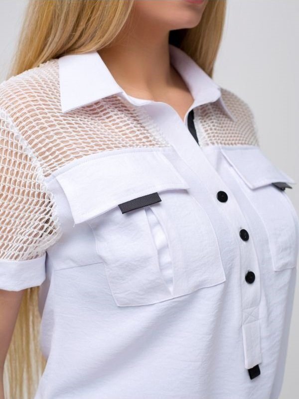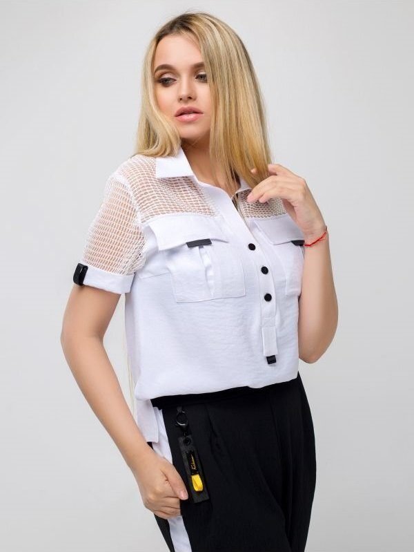 Женский комбинезон-трансформер из дышащего, комфортного материала. Блуза с брюками соединяется молнией. Блуза с воротником рубашечного типа, кокетка и рукава оформлены сеткой. Застегивается по полочке на пуговицы. Дополняют изделие накладные карманы с клапанами. Спинка слегка удлинена, по бокам разрезы.