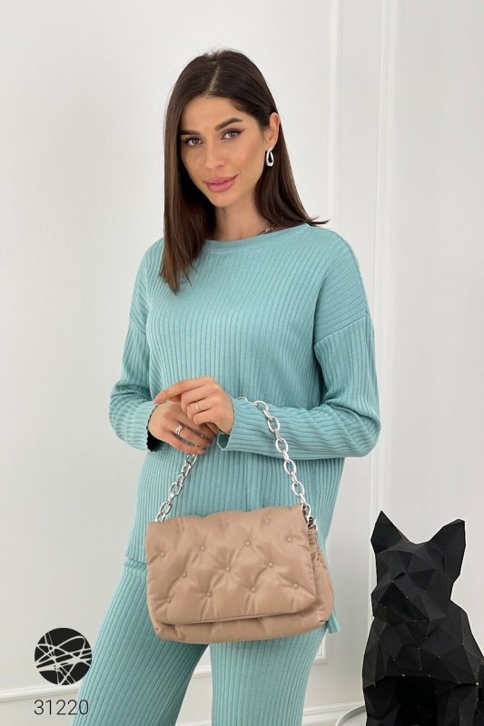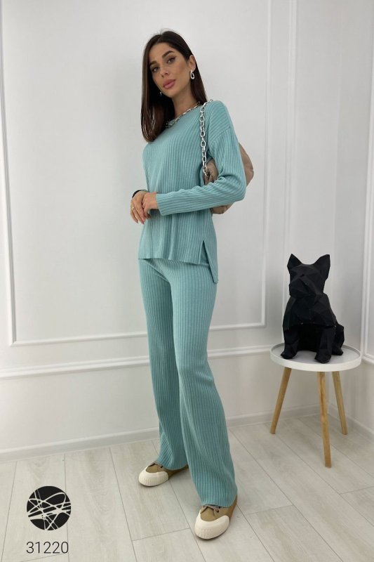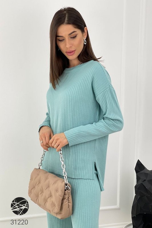 Костюм из качественного трикотажа, производства Турции. Джемпер с круглым вырезом, заниженная линия плеч, асимметричный нижний край с боковыми разрезами. Брюки-палаццо с завышенной талией, пояс на резинке. Состав ткани: 50% - вискоза, 50% - акрил.