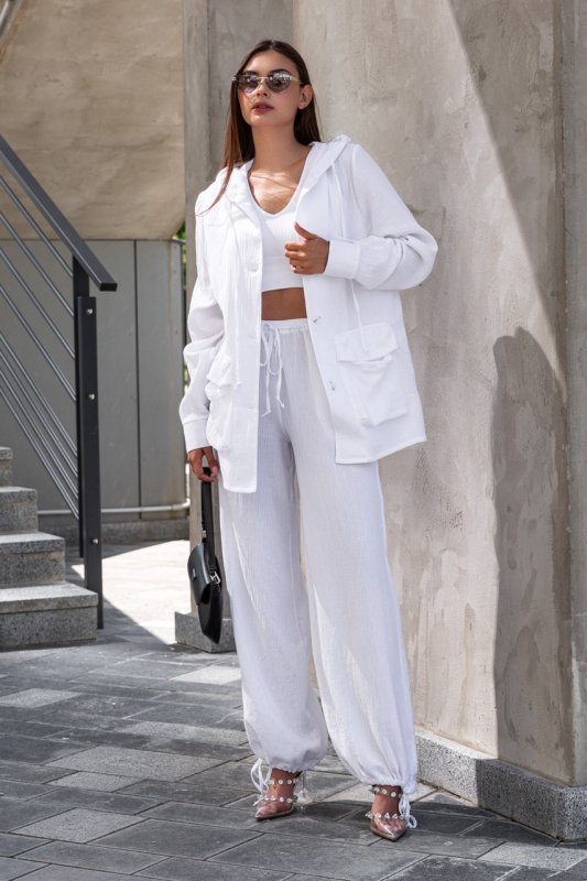 Этот легкий и воздушный костюм – идеальный вариант для женщин, которые любят сочетать комфорт и стиль. Рубашка оверсайз кроя с длинным рукавом и брюки свободного кроя, создающие идеальную посадку на любой фигуре. Рубашка украшена объемными карманами с клапанами и капюшоном с контрастным шнуром.