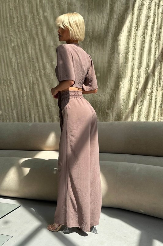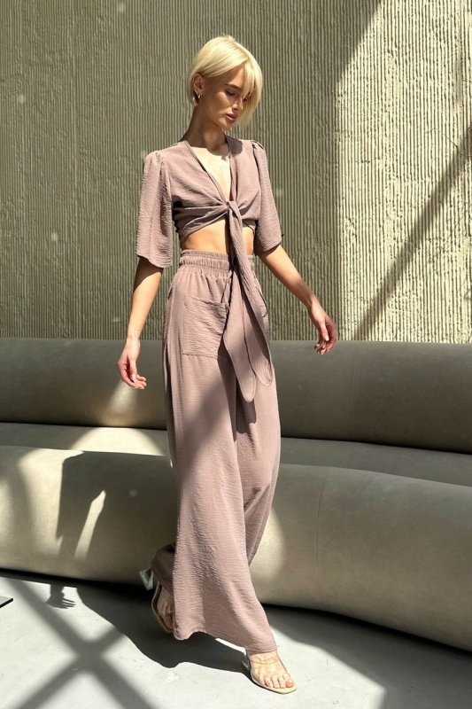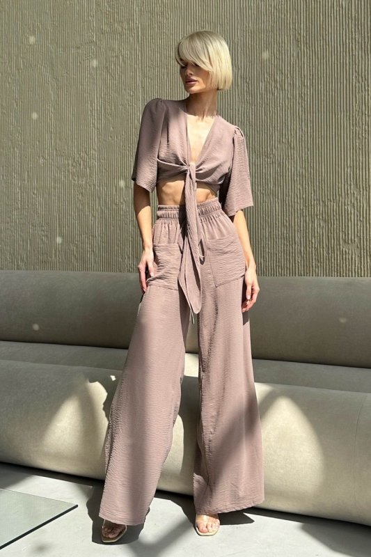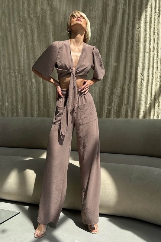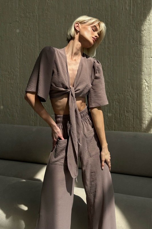 Практичный костюм с топом на завязках и глубоким декольте задает настроение всему образу. Костюм выполнен из легкого американского крепа. Топ с короткими рукавами. Брюки свободного кроя с эластичной вставкой в талии.