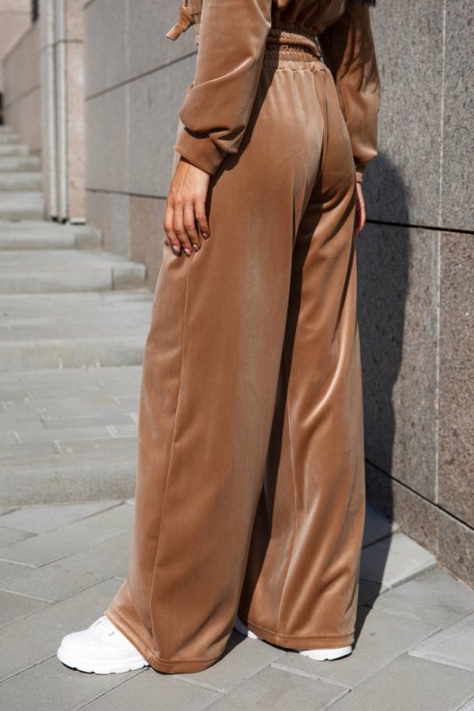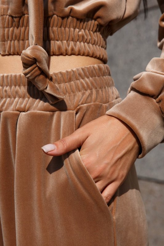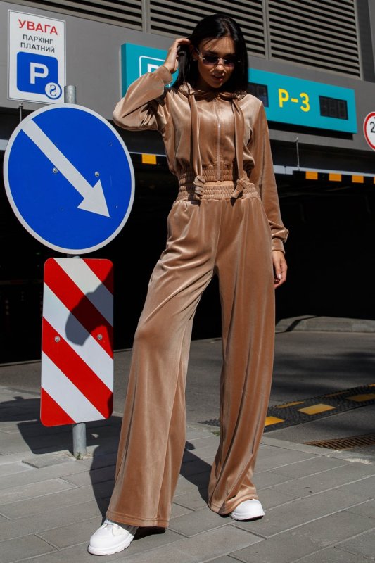 Модный женский костюм с велюром в стиле спорт-шик. Наш новый прогулочный костюм – двойка – отличный выбор на теплую осень! Главным критерием для повседневной одежды остается комфорт. В новой модели Вы будете чувствовать себя удобно и комфортно, ведь это так важно в современном ритме жизни. Модель костюма сочетает в себе свитшот с длинными рукавами с капюшоном и штаны – кюлоты свободного кроя.