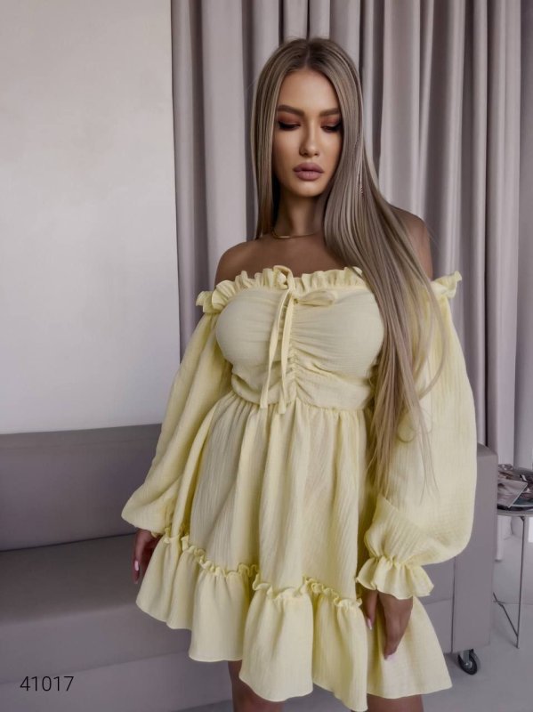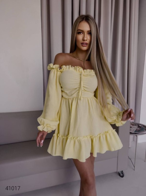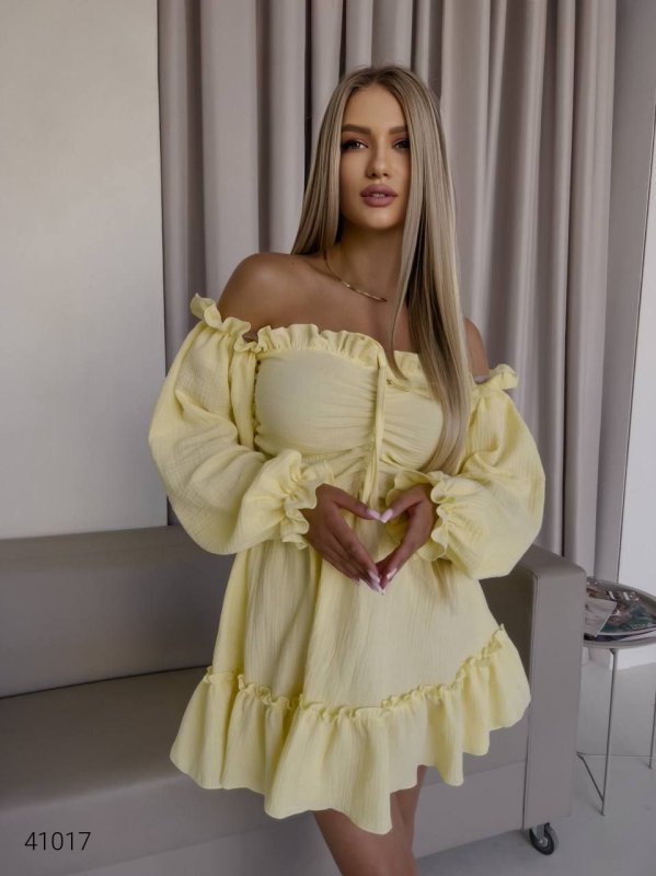 Летнее платье фонарик с длинными рукавами 41017 желтый