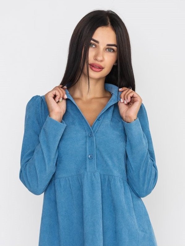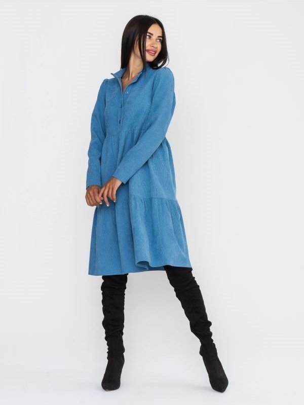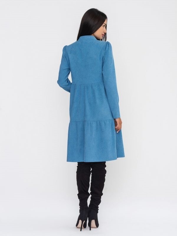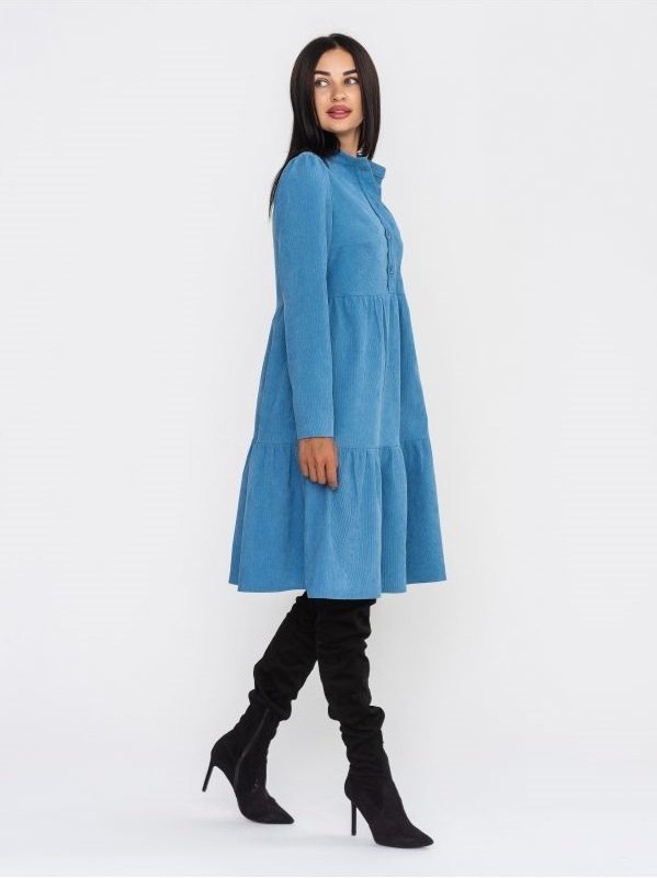Женственное платье расклешенное от линии талии с воротником-стойкой. Застегивается по полочке на пуговицы. Модель дополняет юбка каскадного типа, что делает данное платье сочетаемым с фигурой любого типа.