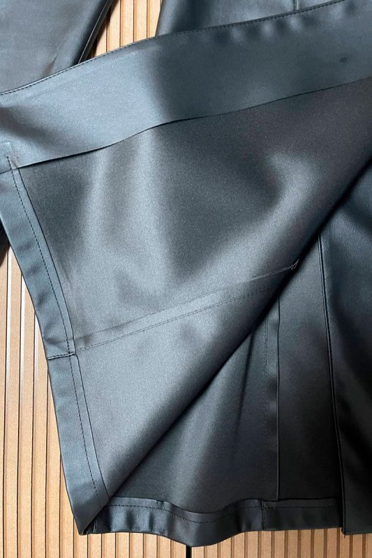 Платье из эко-кожи длины мини с длиным рукавом. В комплект входит пояс. Платье дополненно накладными карманами. Застёгивается на пуговицу.
