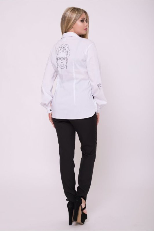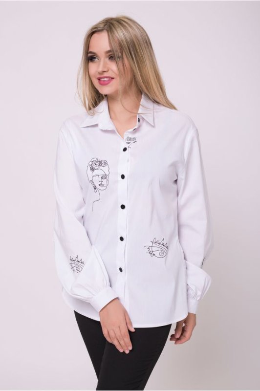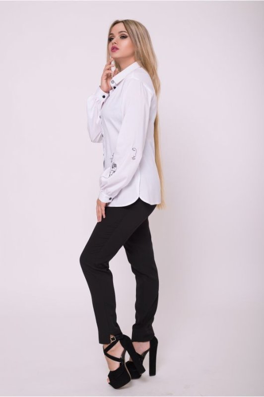 Стильная женская рубашка белого цвета. Украшена авторской вышивкой. Застегивается на декоративные пуговицы. Над манжетами рукавов защипы. В боковых швах разрезы.