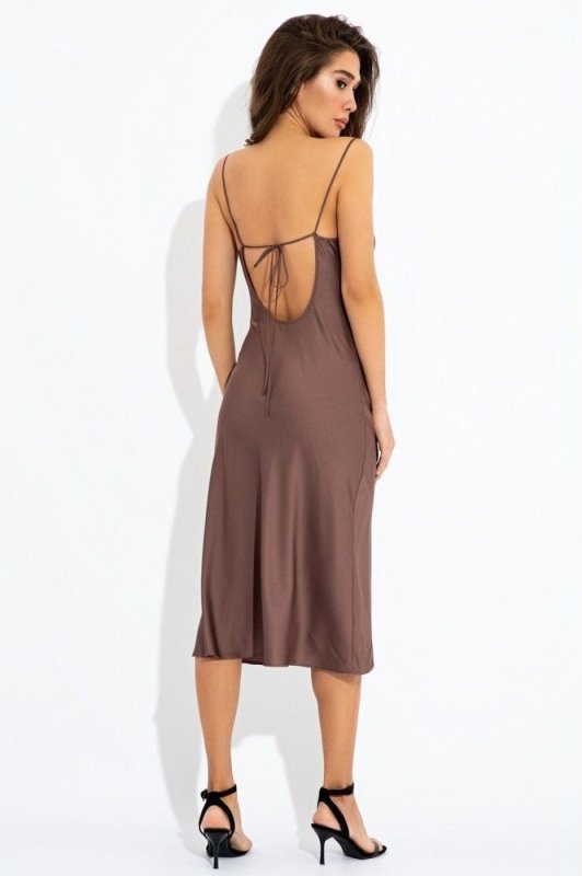 Платье-миди в модном бельевом стиле на тонких регулируемых бретелях, глубоким декольте и открытой спинкой на завязках.