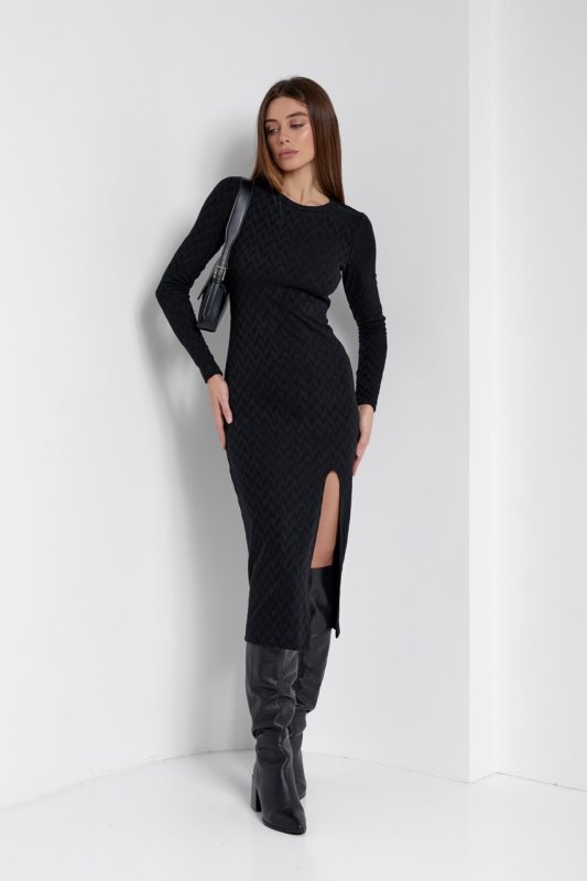 Трикотажное обтягивающее платье длиной миди с высоким разрезом на левой ноге. Вырез горловины круглый, с планочкой. Рукава вшивные, длинные. Спинка со средним швом и выточками.