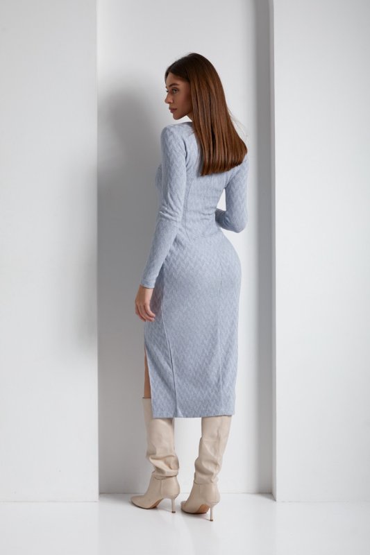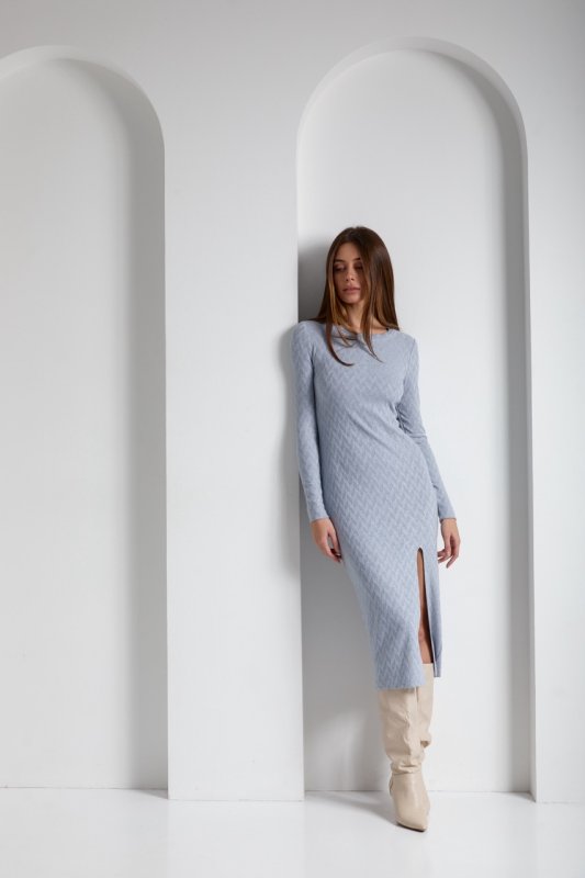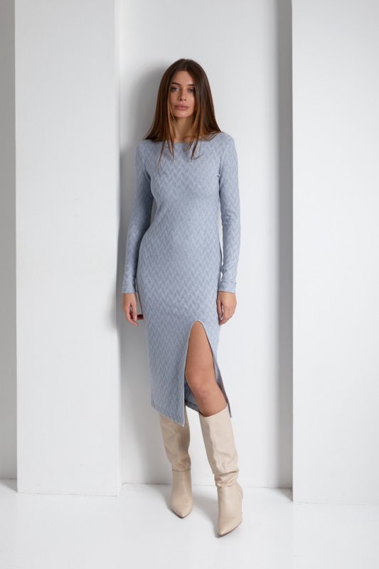 Трикотажное обтягивающее платье длиной миди с высоким разрезом на левой ноге. Вырез горловины круглый, с планочкой. Рукава вшивные, длинные. Спинка со средним швом и выточками.