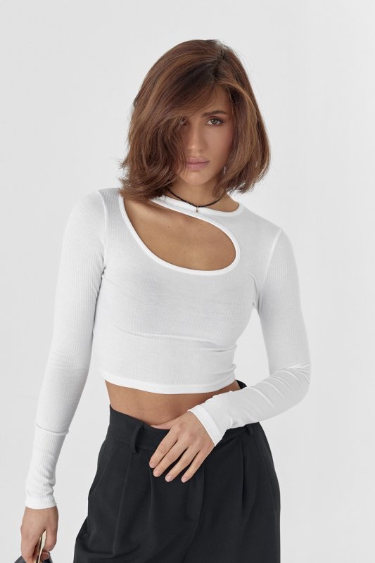 Трикотажный джемпер в рубчик с каплевидным вырезом - 8762 молочный