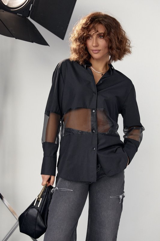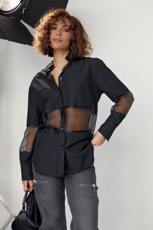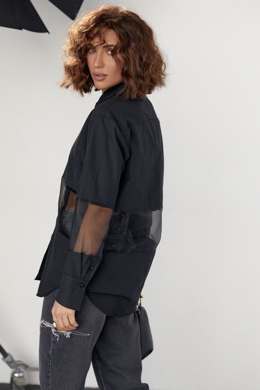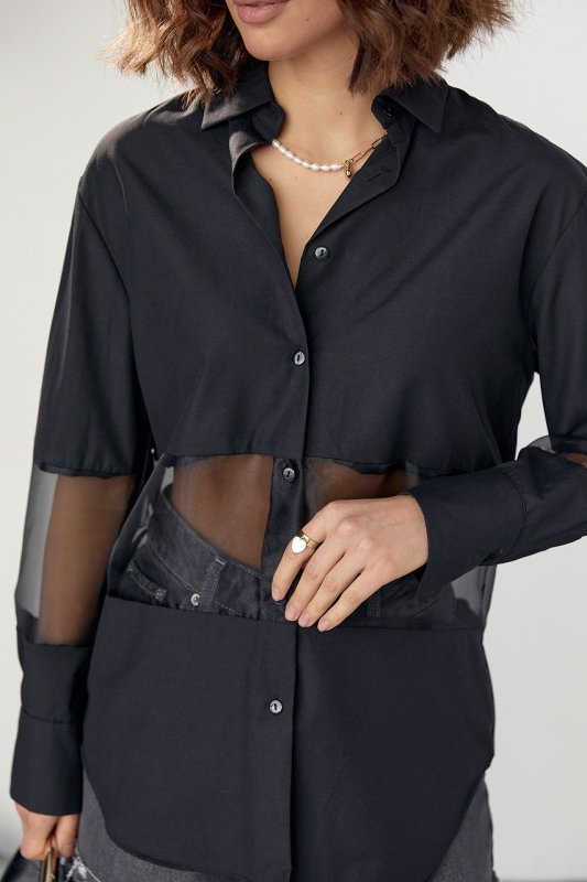 Удлиненная женская рубашка с прозрачными вставками - 23282 черный