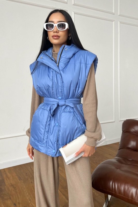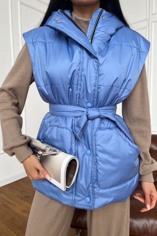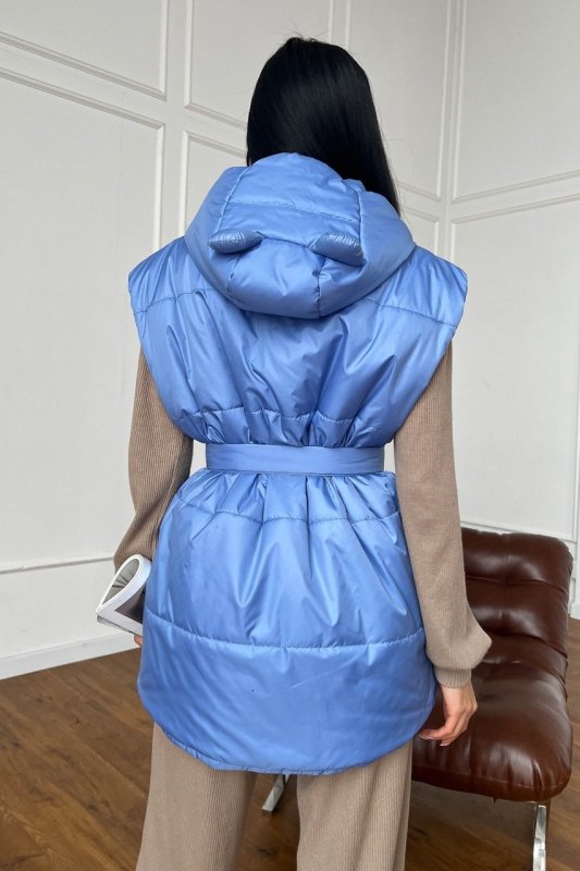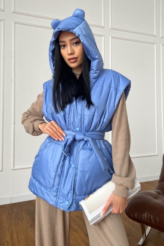 Наша новинка – стильный удлиненный жилет из плащевки на молнии и кнопках с капюшоном. В качестве утеплителя выступает синтепух (150 г/м2). Модель представлена в актуальных в этом сезоне цветах на любой вкус. Жилет декорирован милыми ушками на капюшоне. Большие накладные карманы придают практичности и удобству. Пояс в комплекте.