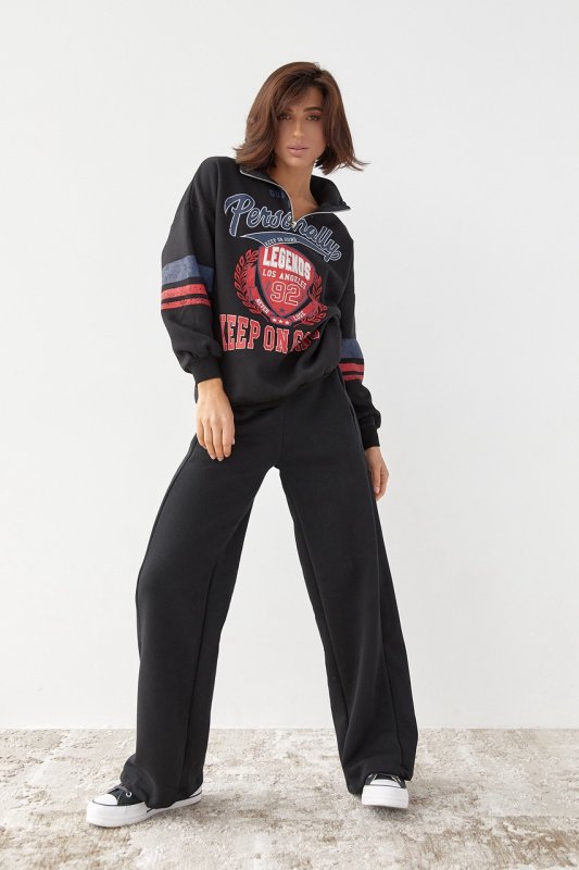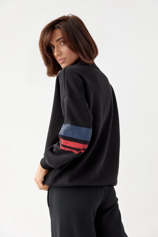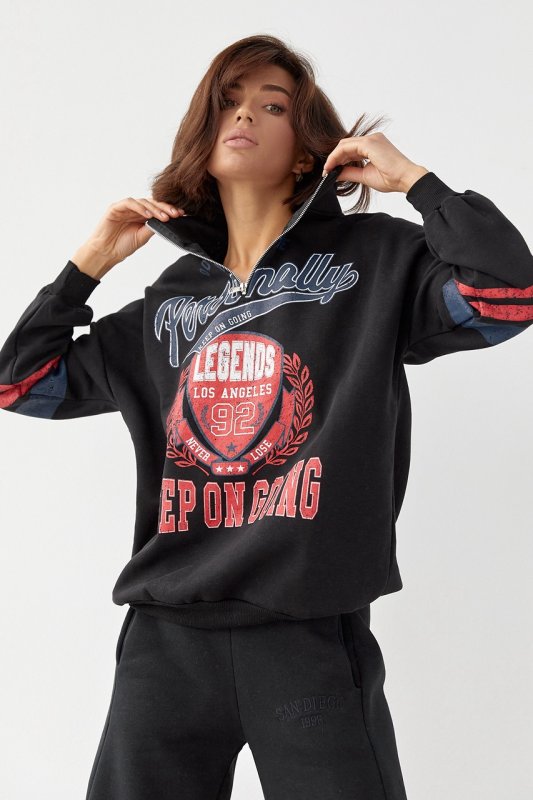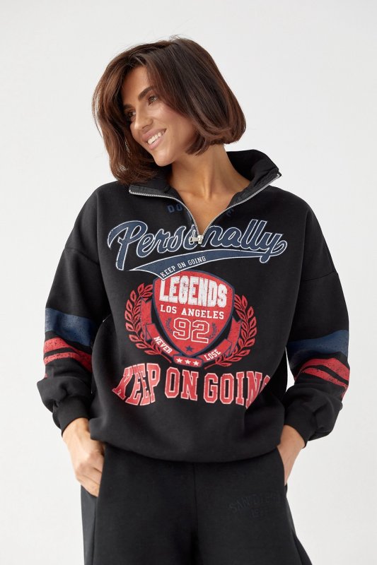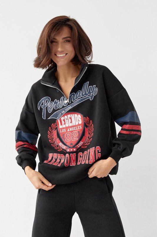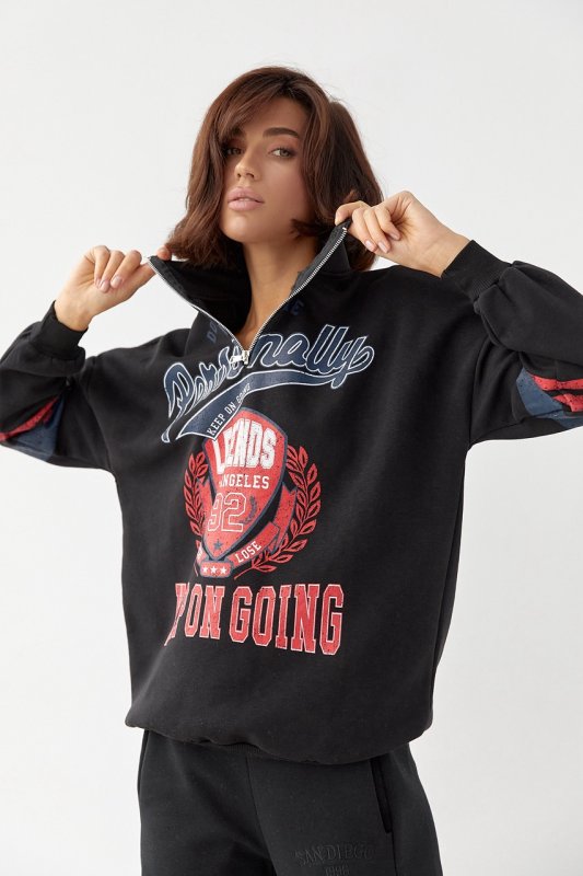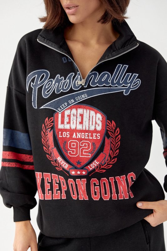 Этот свободный свитшот порадует модниц удобным кроем и оригинальным дизайном. В модели прямой низ и длинные рукава обшиты манжетами из рибаны. Круглая горловина идет с воротником-стойкой, а спереди вверху изделие застегивается на короткую металлическую молнию. Также передняя часть кофты и основная часть рукавов украшены принтом.