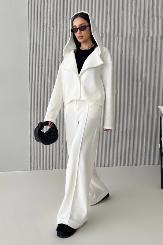 Жакет однобортный свободного кроя, с капюшоном. Длинный рукав со спушенным плечом. Отложной воротник с острыми лацканами переходит в капюшон. Застегивается на пуговицы, на внутренней части жакета – съемная диталь под пуговицы.