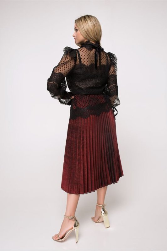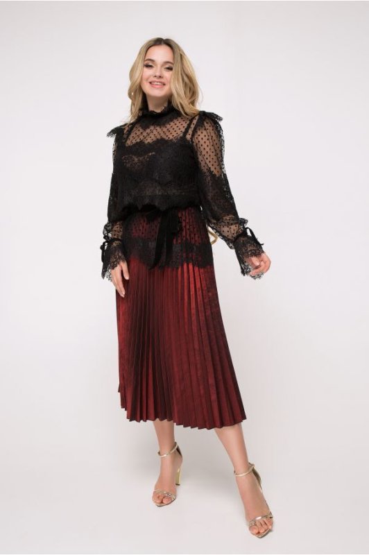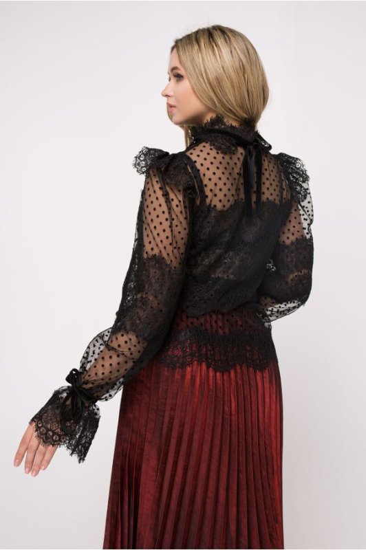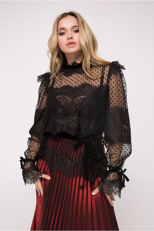 Романтична жіноча блуза Beliv виконана з легкого, непомітного матеріалу. Оздоблена гіпюром в тон виробу в області декольте і на рукавах. Прикрашають блузу оксамитові стрічки - зав'язки (на талії і на рукавах). В комплект входить чокер з гіпюру на оксамитової стрічки. Застібається по спинці на декоративну гудзик.