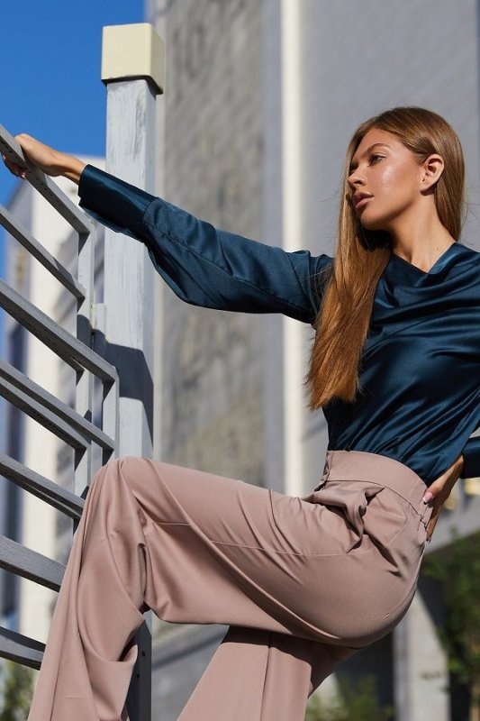 Красива блуза з шовкової тканини. Горловина виробу виконана в стилі хомут створюючи на грудях розкішні хвилі з блиском тканини. Довгий рукав з високим манжетом застібається на гудзик додає легкості. Модель відмінно комбінується з брюками і спідницею, надаючи образу ділового або вечірнього стилю.