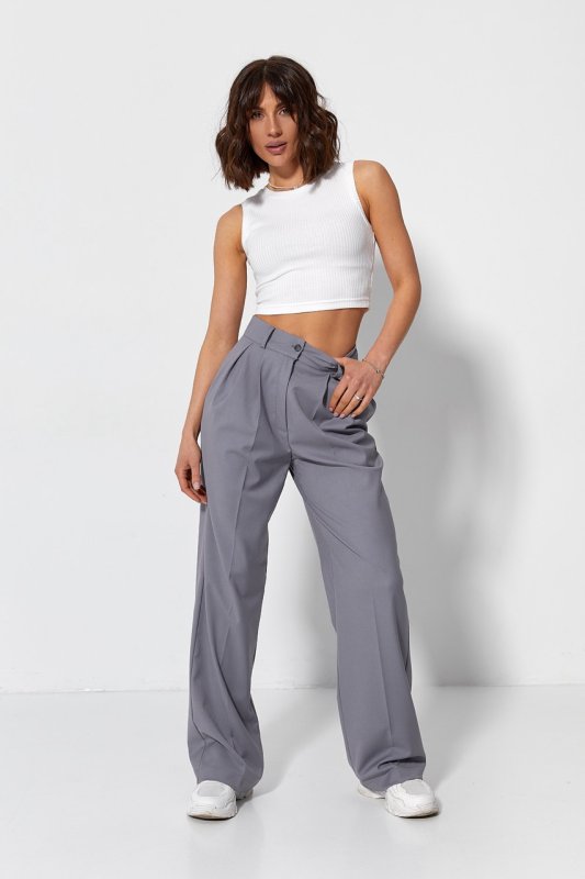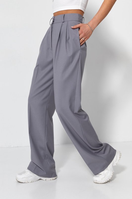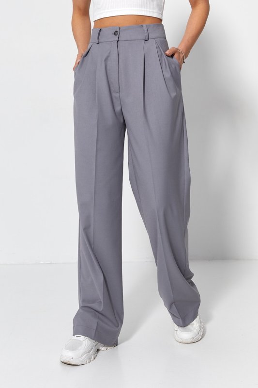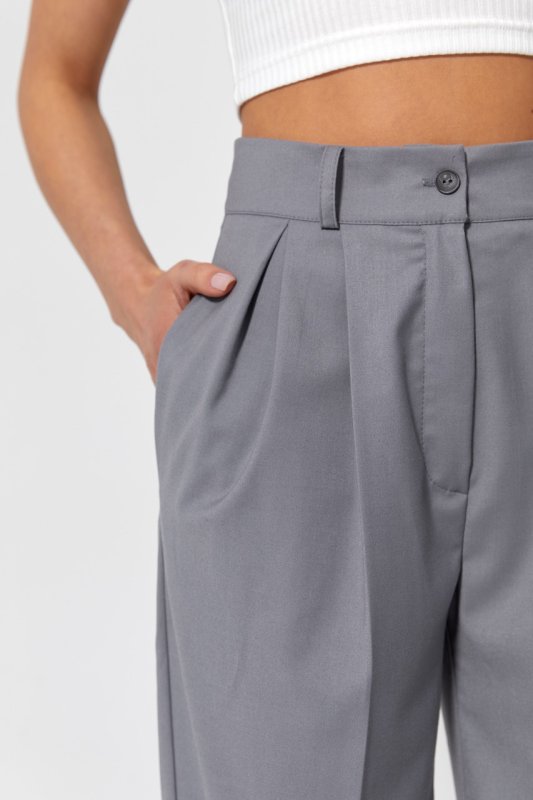 Брюки палаццо прямого крою. На талії шльовки для зйомного поясу. Застібка: гудзик і прихована молнія. Передні половинки зі стрілками і складками. Кишені знаходяться в бічних швах. Задні половинки із виточками.