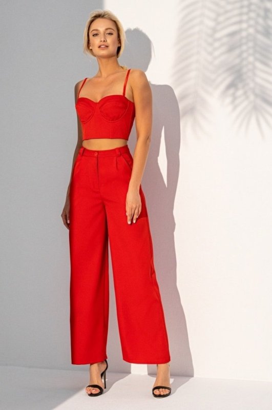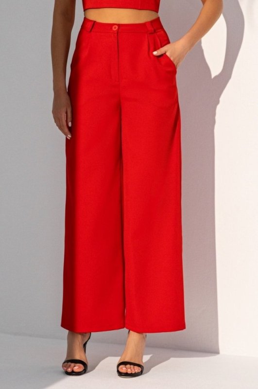 Широкі штани-палаццо із завищеною талією і бічними кишенями з костюмної тканини. Застібаються на блискавку і гудзик. Струмлива до підлоги тканина додає образу витонченість, але при цьому підкреслює свободу і розкутість своєї власниці.
