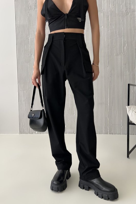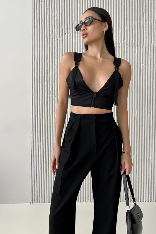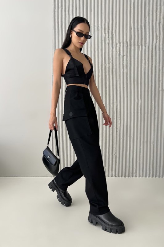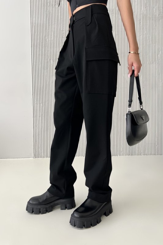 Брюки-карго з щільної костюмної тканини з накладними карманами, з защіпамт на талії та декоративними шльовками.