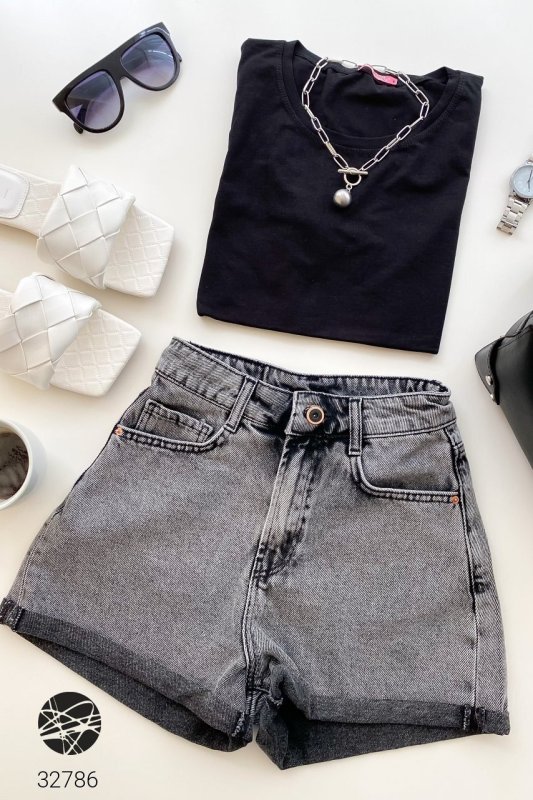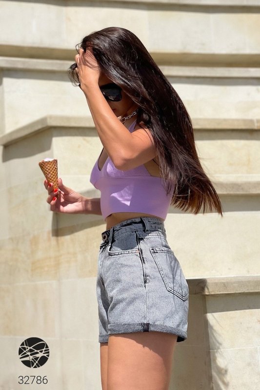 Шорти з якісного щільного джинса, виробництва Туреччини. Завищена талія, шлевки, нижня кромка з вилогами. Накладні кишені ззаду і бічні прорізні спереду. Прихована ширінка із застібкою на блискавку і гудзик. Склад тканини: 100% - котон.
