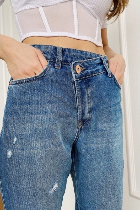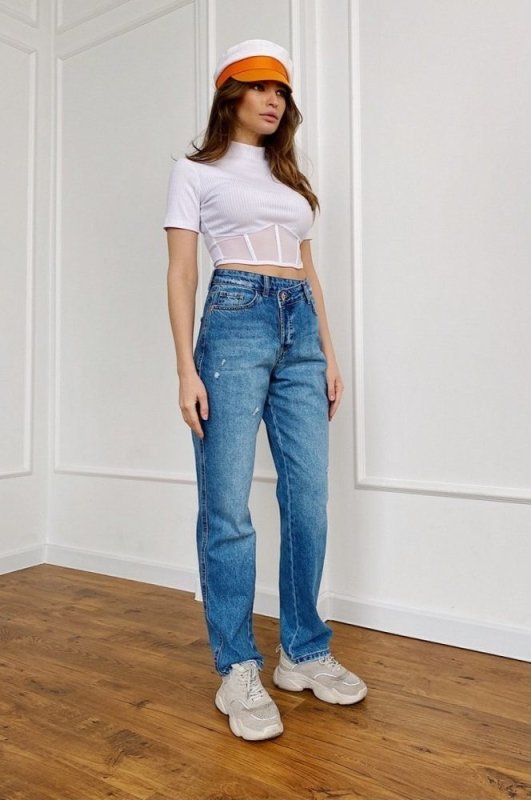 Модні джинси з асиметричною застібкою на волотистих ґудзиках. З внутрішньої сторони застібається на гудзик. Вільний крій і коса застібка додасть індивідуальності і виразності вашому образу. Вироблено в Туреччині.