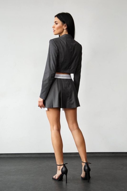 Трендоввий костюм із укороченого жакета зі спідницею у складку модного сірого кольору. Стильний дизайн, актуальний колір, зручна посадка - це тільки частина переваг цього костюма. Він підійде будь-якому типу фігури, якщо вас не бентежить довжина міні. Можна поєднувати як із взуттям на високих підборах так і з низьким ходом.