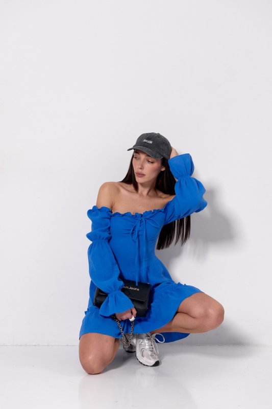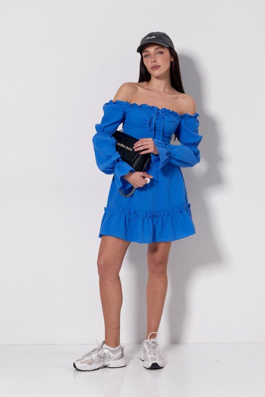 Однотонна муслінова сукня міні. Виріз горловини з рюшою. Спереді зі зборкою на грудях. Спідниця - кльош, зібрана на талії, по низу спідниці рюша. Рукава довгі. По верху і по низу рукава резинка. Спинка зібрана резинкою, яка гарантує прилегання.