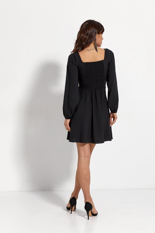 Сукня міні, приталена до талії, спідниця кльош. Перед на затин з широким поясом. Середня частина спинки зібрана резинкою, що забезпечує прилегання. Рукава довгі, фантазійні, верхня частина рукава зібрана резинкою і являється брителью. Низ рукава також зібран резинкою.