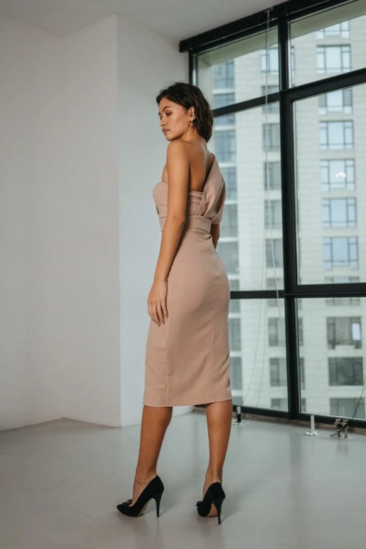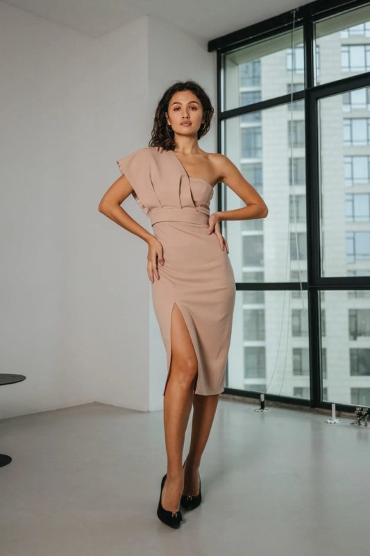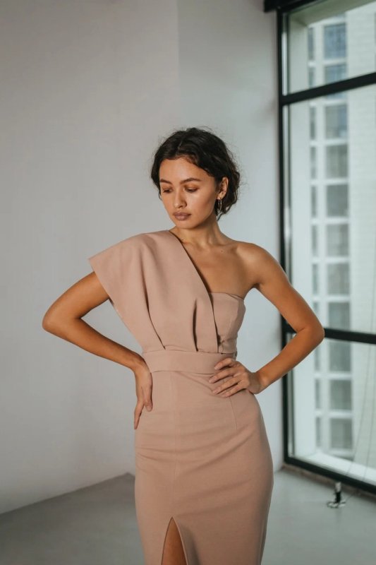 Сукня з декоративною накидкою та розрізом, виготовлена з креп-дайвінгу. Воно напівприталене та силуетне, підходить для демісезону (весна-осінь). Рельєфні деталі та талева виточка додають текстури та об'єм.