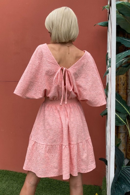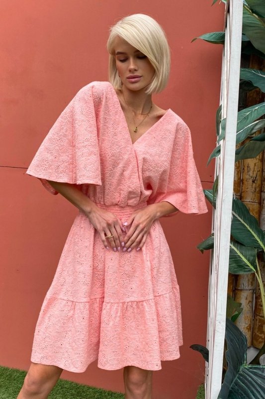 Актуальна сукня з прошви у ніжному рожевому кольорі: фіксований запах, глибокий v-подібний виріз, розкльошений короткий рукав, відрізна талія, по поясу резинка і коротка спідниця з воланом. Особливість моделі – цікаво оформлена спинка з глибоким вирізом на зав’язках.