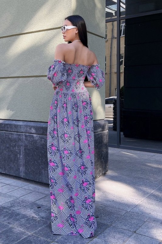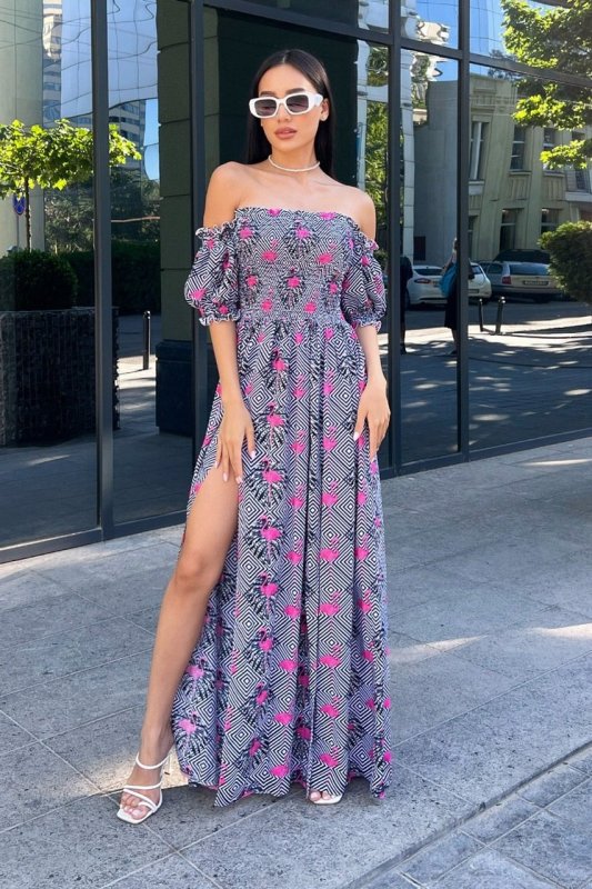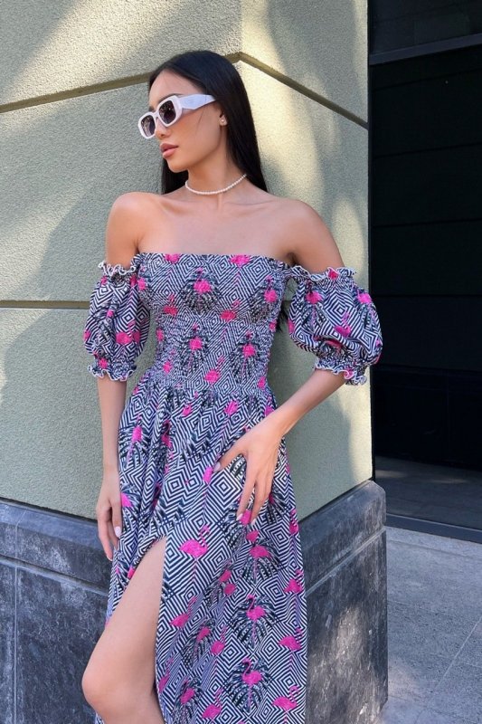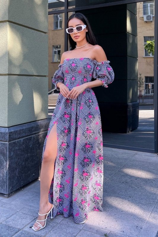 Ніжність асоціюється виключно з легкими тканинами і повітряним кроєм - надзвичайно ефектна і сексуальна літня сукня в підлогу з принтованого штапелю - те, що потрібно на спекотне літо. Довга спідниця в підлогу візуально витягне силует, додасть Вам шарму та привабливості. Цікаво оформлений ліф на резинках сукні будуть притягувати погляди протилежної статі. А розріз по спідниці привернуть увагу до Ваших ніжок! Безперечно, у цій сукні Ви будете королевою вечора.