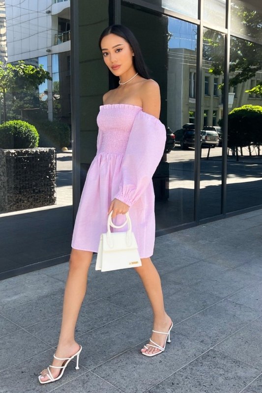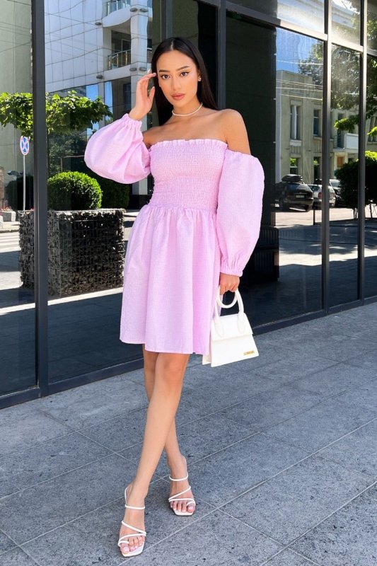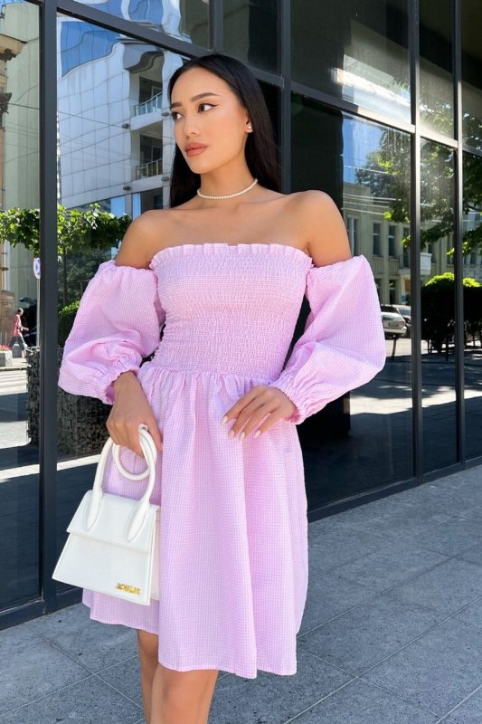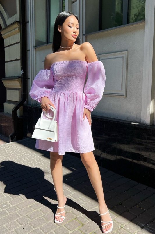 Міні-сукня із завищеною талією, еластичним ліфом і відкритою лінією плечей, буде особливо актуально в жаркі дні. Легка однотонна модель з рукавами-ліхтариками, зшита з дихаючого тонкого матеріалу виконано в яскравій палітрі літніх кольорів.
