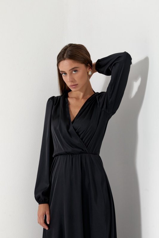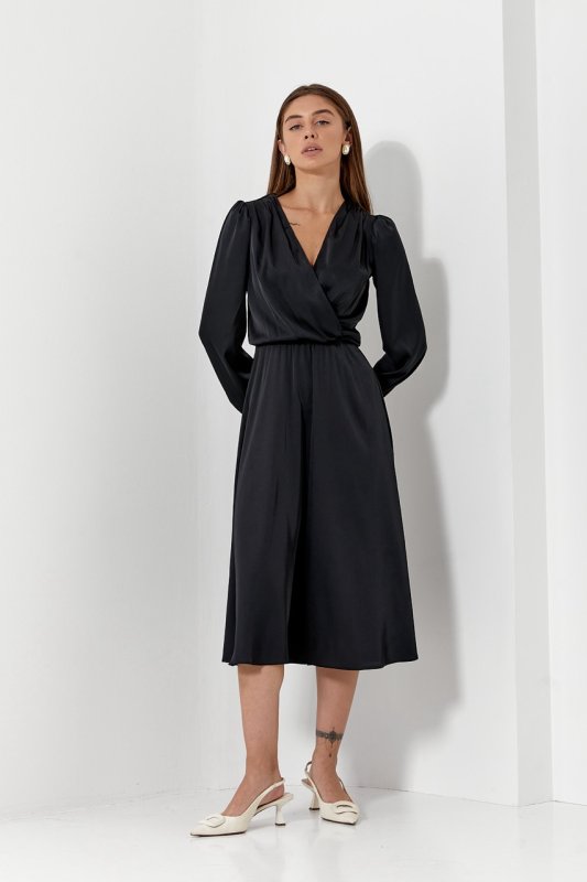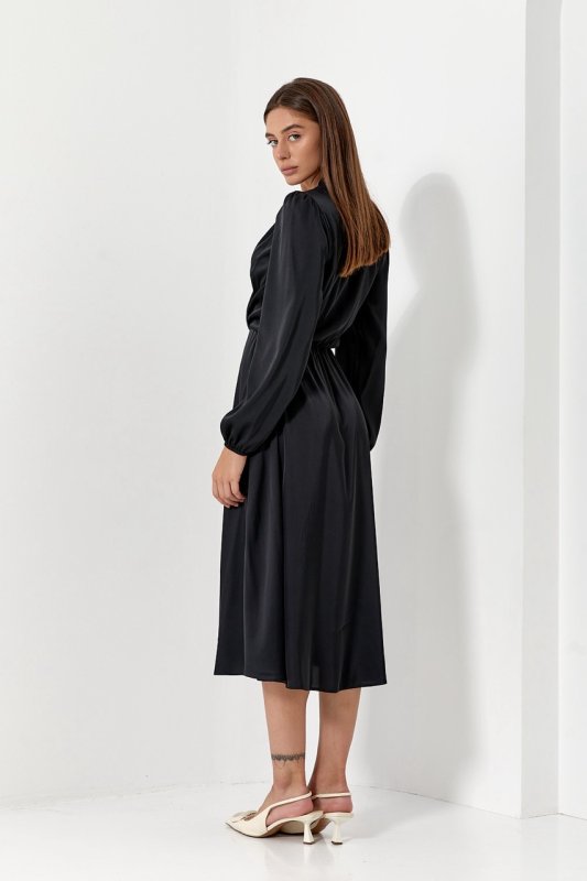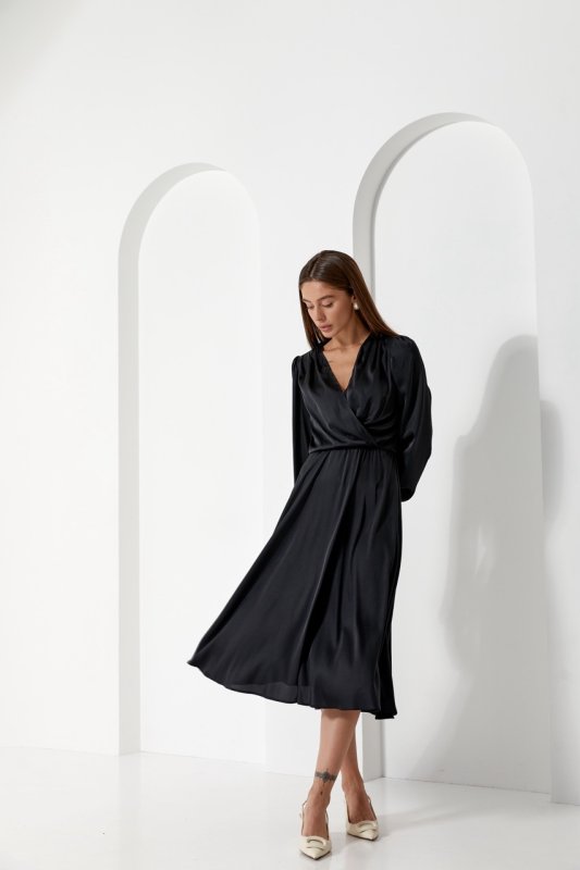 Шовкова сукня міді на затин, відрізна по талії. Ліф пілочки із складками, які виходять з лінії плеча. Рукава вшивні, довгі, низ і окат зібрані на резинку. Спідниця - кльош. Талія фіксується резинкою.