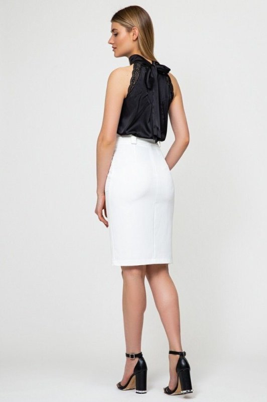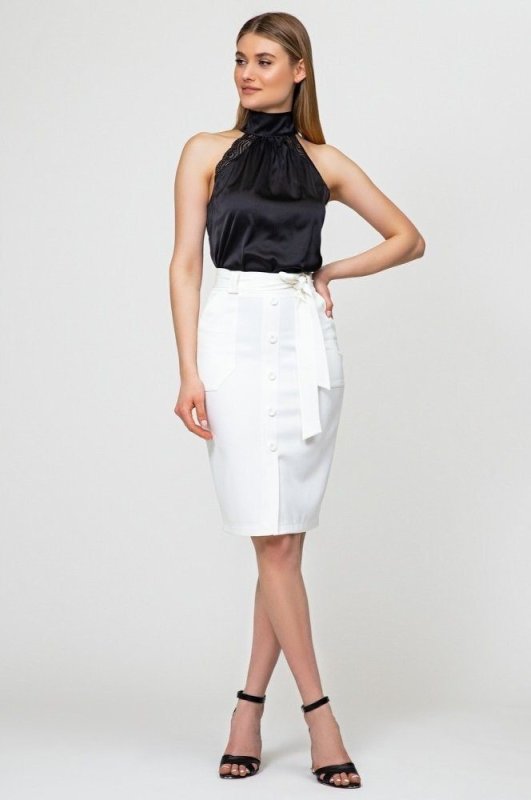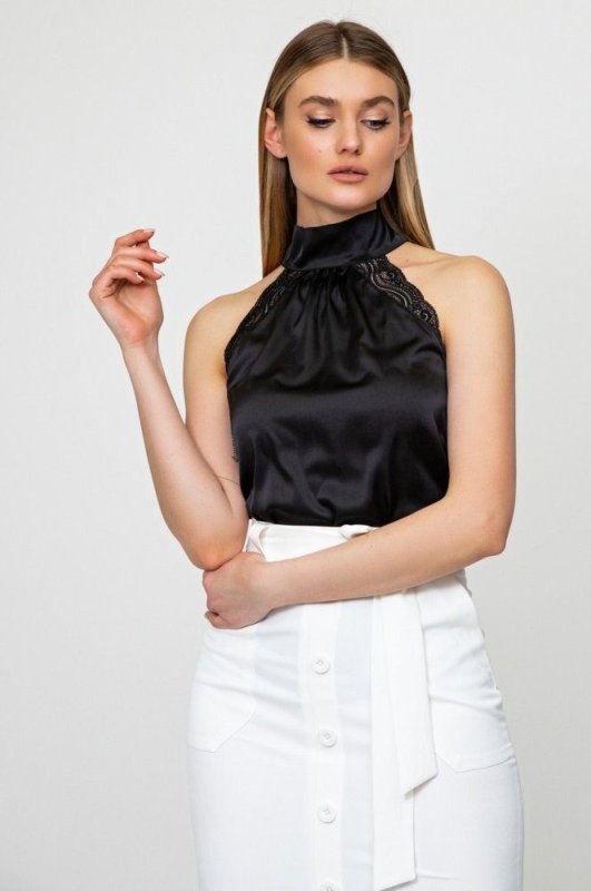 Шовкова блуза з високим коміром, прикрашена ніжним мереживом з боків, а ззаду зав'язується на бант.