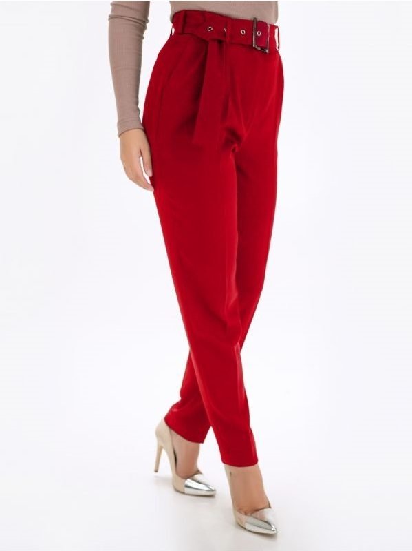 Класичні брюки-банани зі стрілками, завужені донизу. З боків косі кишені. У комплекті пояс в тон виробу з пряжкою. Застібаються на гудзик і блискавку.