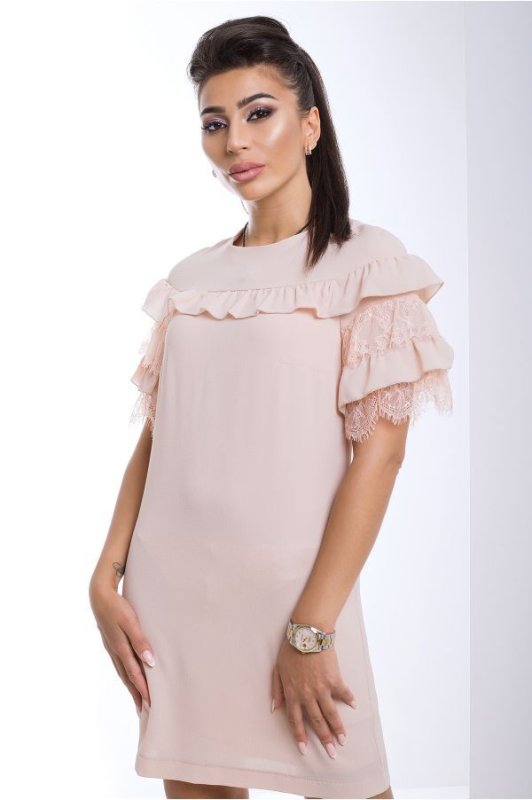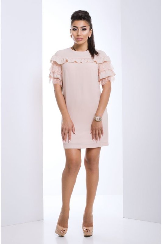 Перед вами неймовірно жіночна сукня, що володіє унікальним дизайном! Модель злегка прилеглого силуету. Прикрашає виріб легка рюшу спереду і на спинці. Оригінальним рішенням є рукави сукні, виконані з комбінації шарів гіпюру і основного матеріалу. Передбачена легка трикотажна підкладка з гладкою текстурою. Застібається сукню на потаємну блискавку по спинці.
