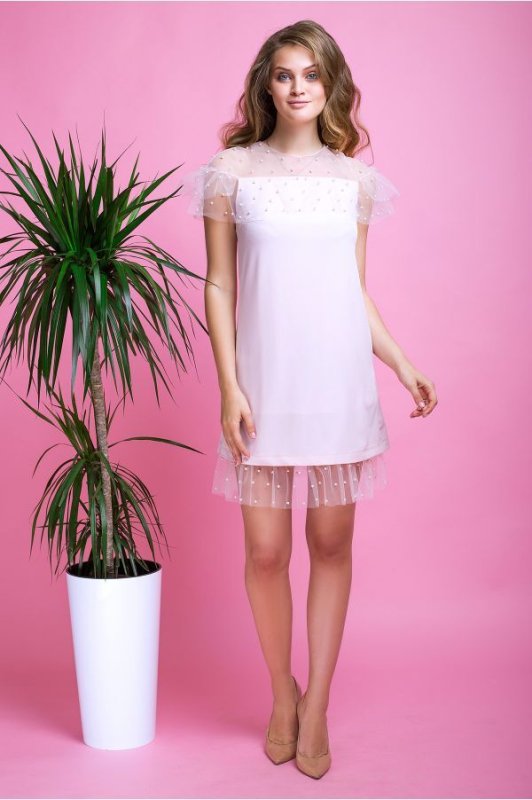 Модель створена з найніжнішого софта, передбачена легка підкладка. Плаття злегка прилеглого силуету, доповнено сіткою з декоративним перлами на кокетці і по низу виробу. Застібається на декоративну гудзичок на спинці.