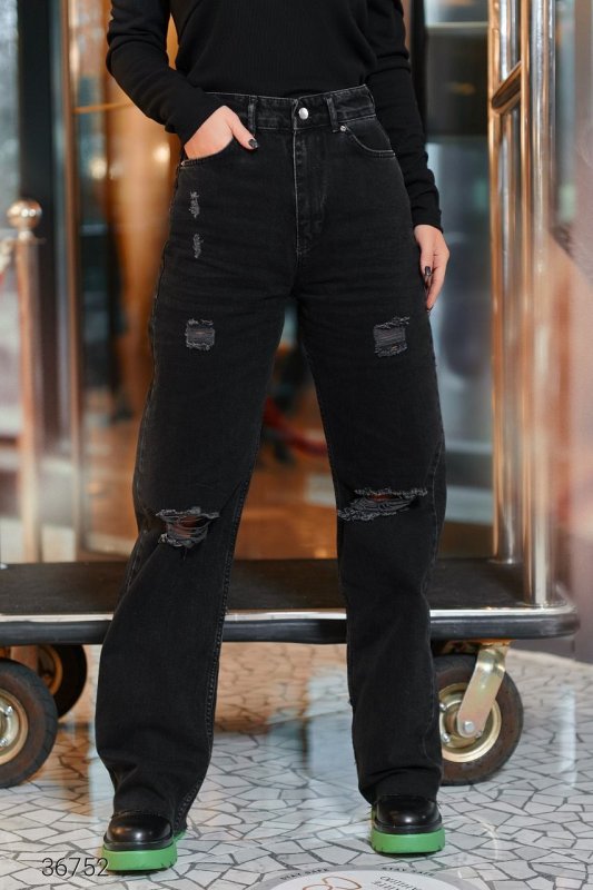 Джинси з широкими штанинами з якісного котону, рвана обробка. Завищена талія, шлевки, бічні прорізні кишені, накладні кишені ззаду, необроблений нижній край. Прихована ширінка із застібкою на блискавку і гудзик. Склад тканини: 98% - котон, 2% – еластан.