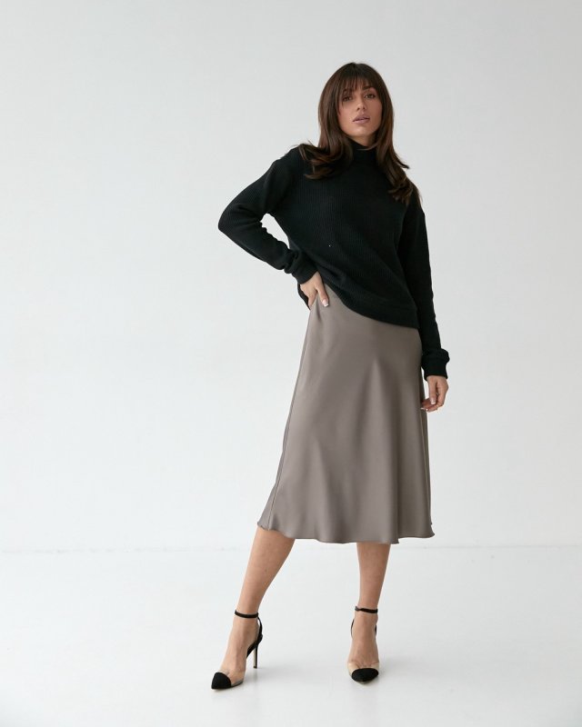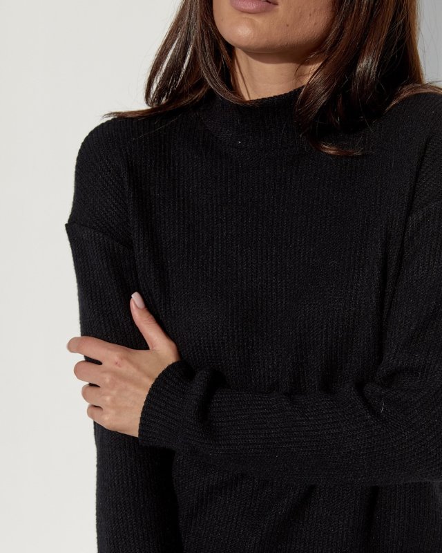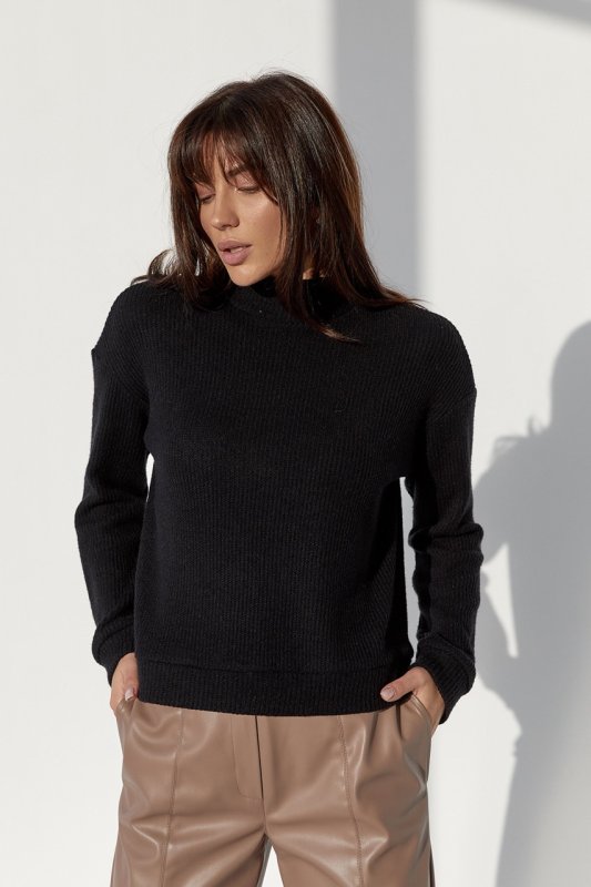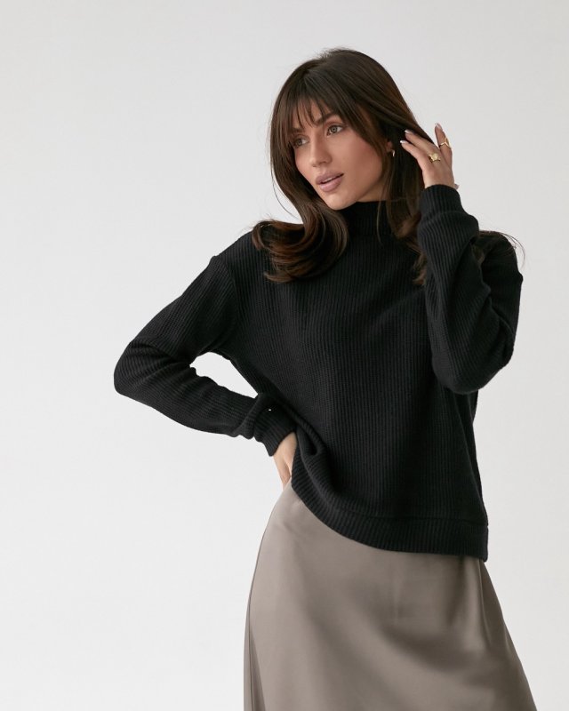 Теплий трикотажний светр із коміром - стійкою. Рівень плеча приспущений, рукава втачні, довгі, по низу рукавів і по низу виробу виконан манжет.