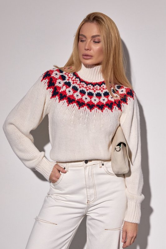 Модель виконана з м'якої теплої пряжі та вгорі спереду, а також на спинці, прикрашена трендовим орнаментом. Кругла горловина обшита коміром-стійкою, а прямий низ і довгі рукави-реглани закінчуються в'язаними манжетами.