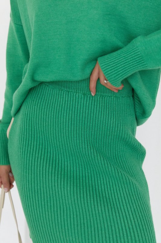 Модель зшита з теплої та дуже приємної до тіла пряжі. У спідниці прямий низ та широка резинка в поясі. Завдяки рубчистій текстурі тканини, спідниця відмінно тримає форму і видовжує силует. Джемпер в стилі оверсайз, довгі рукави, пройми опущені. Краї низу фігурні, горловина доповнена коміром із тканини, складеної вдвоє.