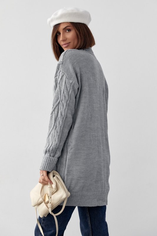 Ця модель виконана з хусткового плетення і прикрашена візерунками з косичок. Високий комір, що складається вдвоє, манжети прямого низу та довгих рукавів виконані з в'язки у широкий рубчик. Лінія плеча подовжена.