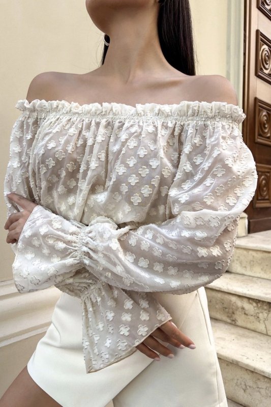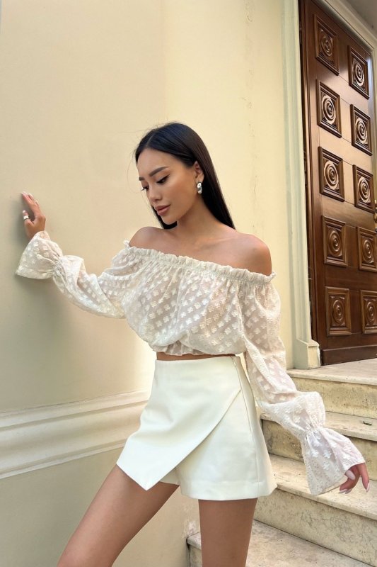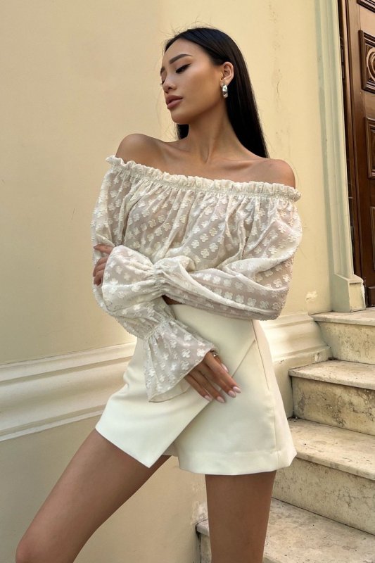 Трендовая блуза укороченного кроя изготовлена из легкого полупрозрачного шифона в нежных летних цветах. Модель отличается глубоким вырезом-лодка с эластичными вставками, что позволяет открывать плечи. Эффектный длинный рукав с воланом и декор рюшами – одни из самых актуальных деталей SS22.